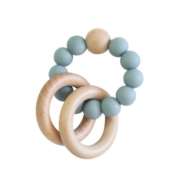Smooth natural beechwood teether ring set in a gorgeous ether blue colour. Features easy to grab shape with soft silicone beads to massage sore gums. Modern and practical! Clean with damp cloth, warm soapy water, rinse clean and pat dry. Comes in a cotton gift bag.