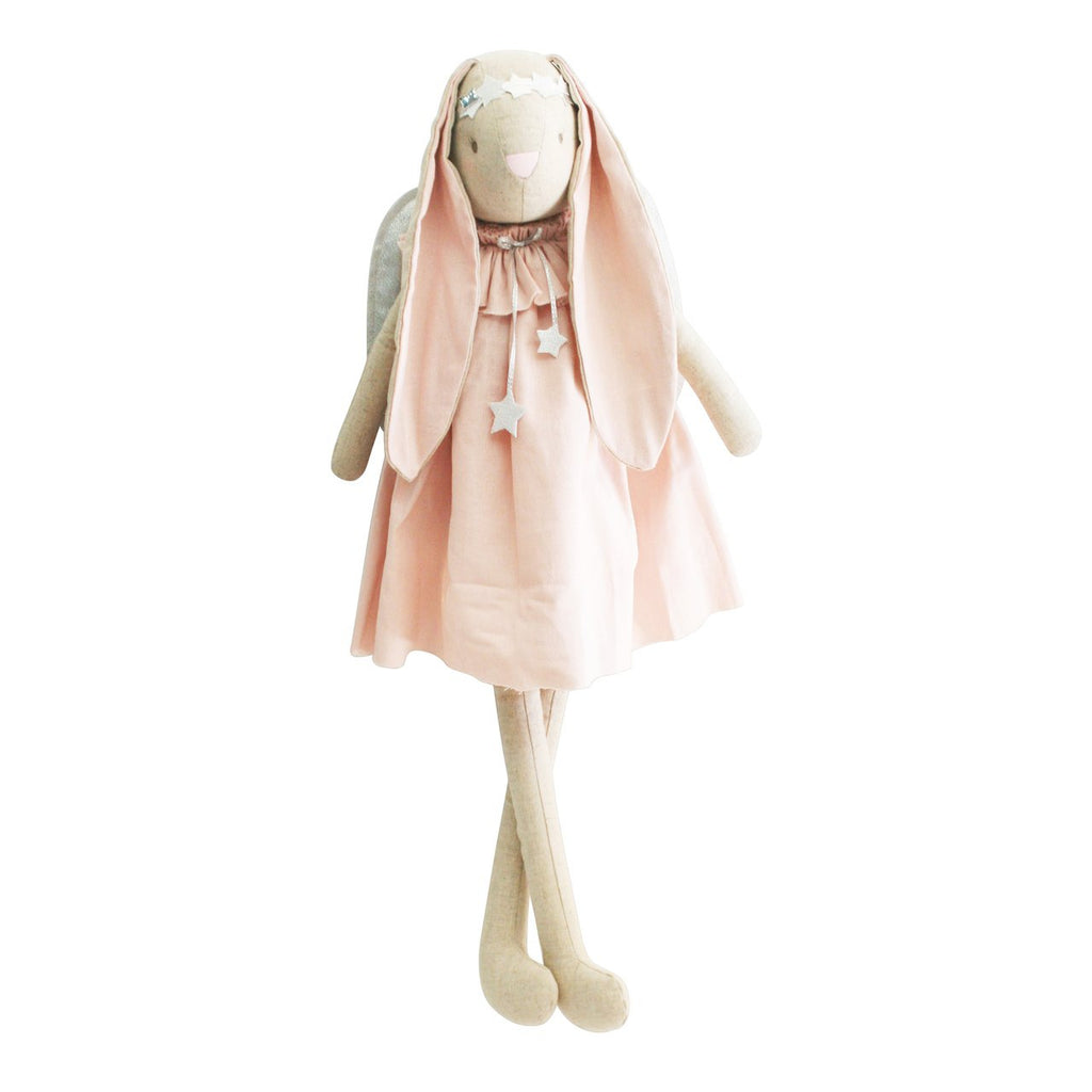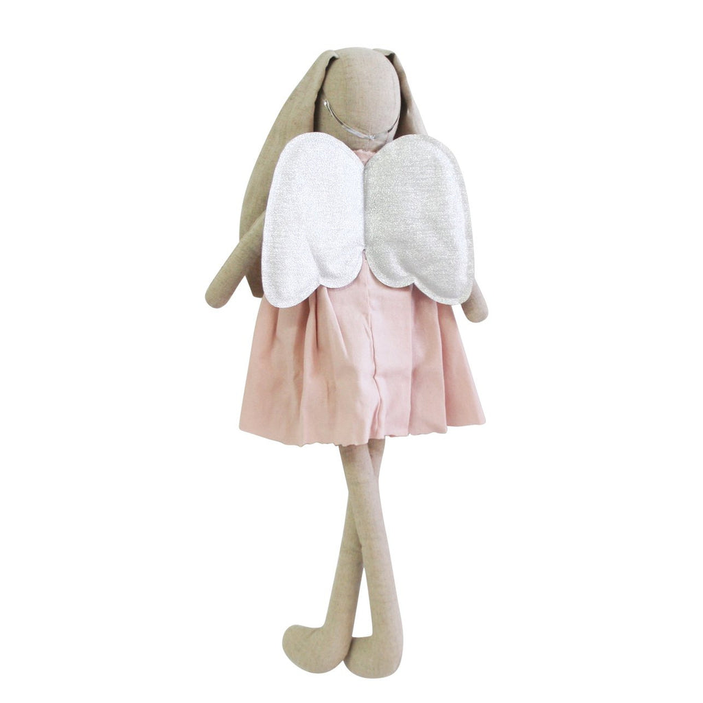 Celeste is an adorable 70 cm linen bunny featuring a cute pink linen dress and sparkly silver angel wings. Suitable from 3 years.