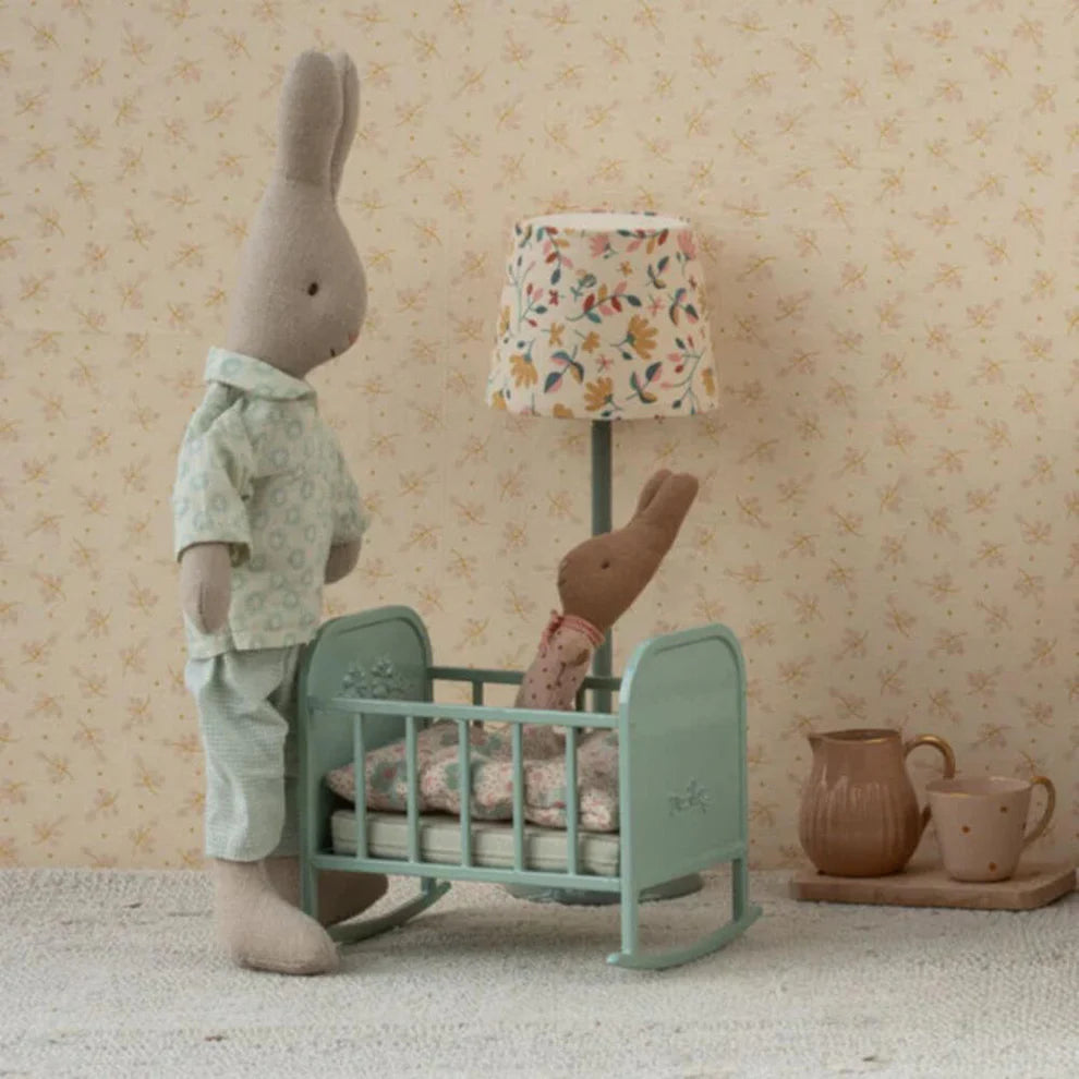 A beautifully designed cradle in metal with a soft sleeping bag and mattress inside. The cradle has a small flower embossment on the headboard and rounded legs so you can rock the little ones to sleep.