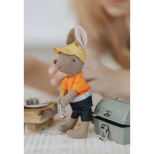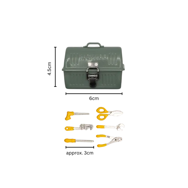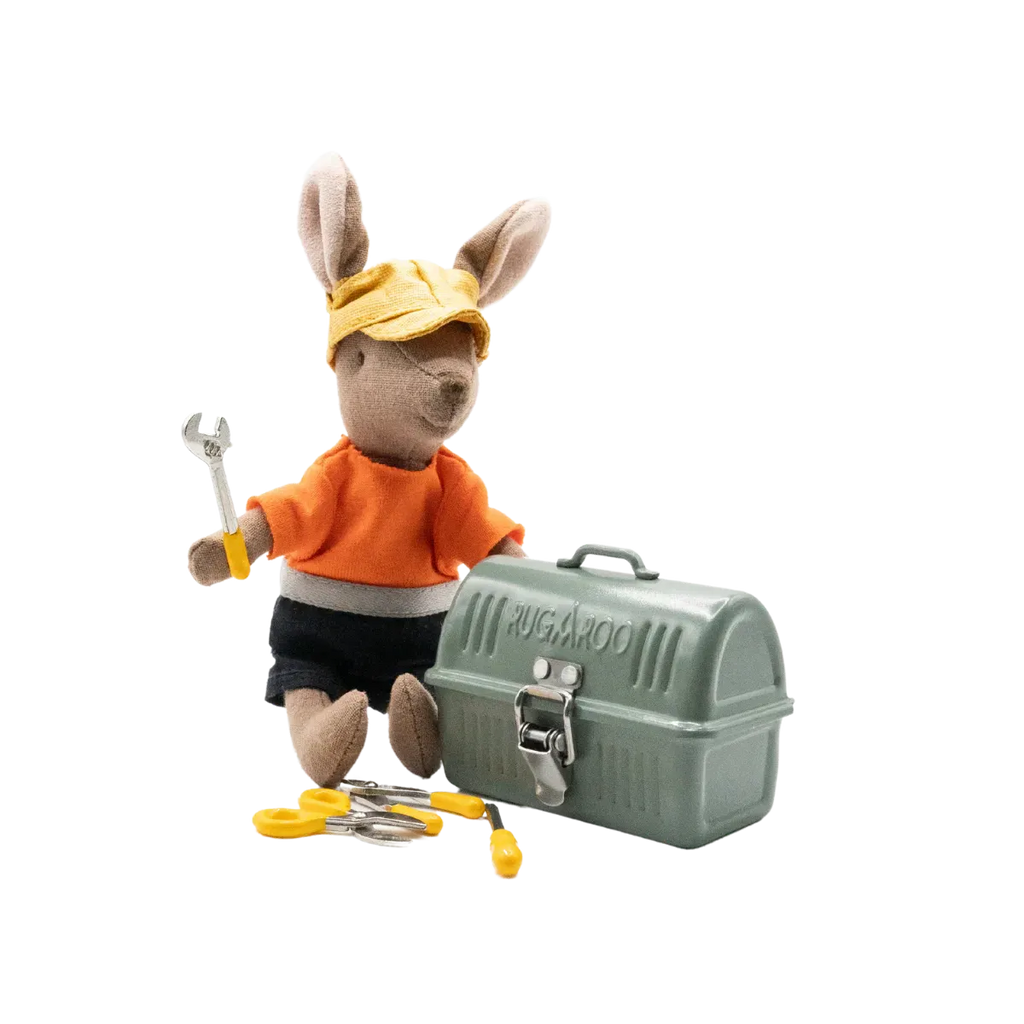 Comes with 1 sturdy miniature toolbox and 6 assorted mini tools (kangaroo doll not included).